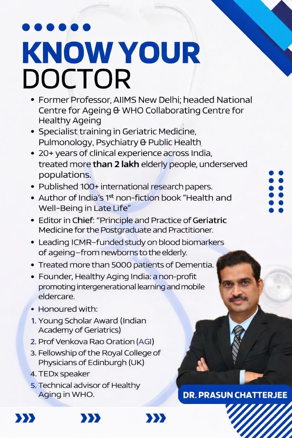 A former Professor of Geriatric Medicine at the All India Institute of Medical Sciences (AIIMS), New Delhi, Dr. Chatterjee has been at the forefront of shaping geriatric medicine in India as both a clinical specialty and a research discipline. He currently serves as Director of the WHO Collaborating Centre for Healthy Ageing at AIIMS, and is a member of the WHO South-East Asia Region Expert Panel for Healthy Ageing and the WHO Clinical Consortium on Health Ageing, contributing to regional and global strategies for ageing societies.